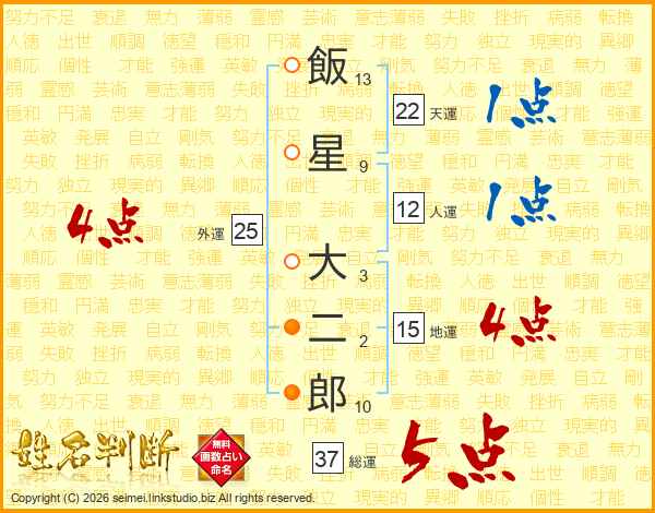 飯(13画)星(9画) 大(3画)二(2画)郎(10画)