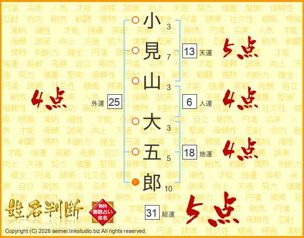 小(3画)見(7画)山(3画) 大(3画)五(5画)郎(10画)