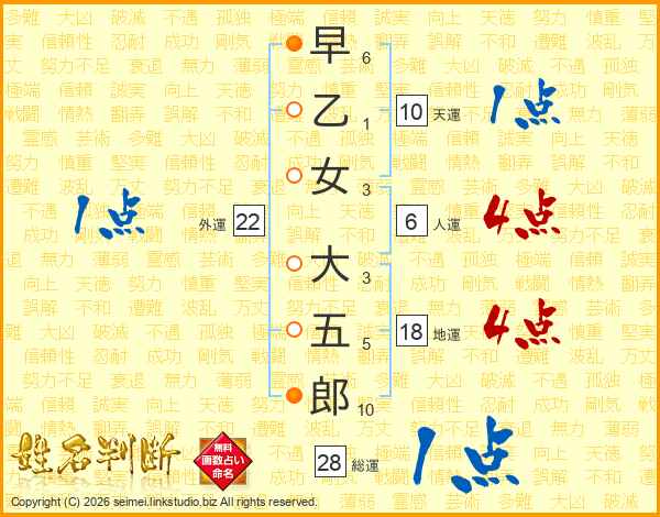 早(6画)乙(1画)女(3画) 大(3画)五(5画)郎(10画)