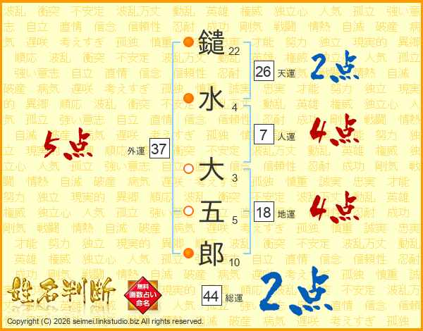 鑓(22画)水(4画) 大(3画)五(5画)郎(10画)
