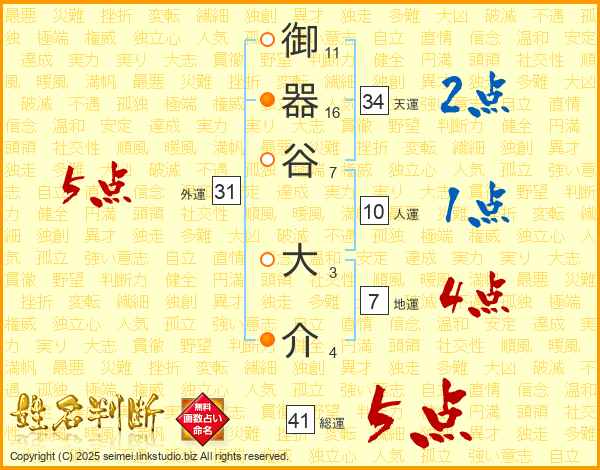 御(11画)器(16画)谷(7画) 大(3画)介(4画)