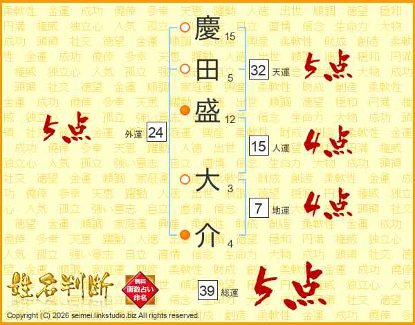 慶(15画)田(5画)盛(12画) 大(3画)介(4画)