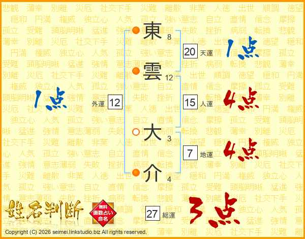 あなたの人生を表す1番重要な運勢です。生涯を通じて影響する総合運となり、主に50歳以降の晩年期に影響を及ぼします。苗字と名前の合計画数。