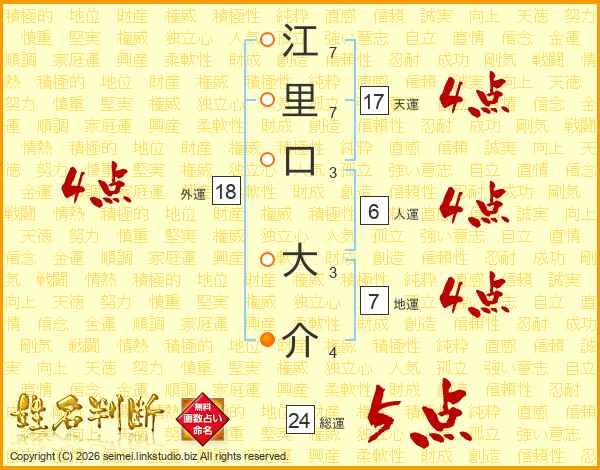 江(7画)里(7画)口(3画) 大(3画)介(4画)