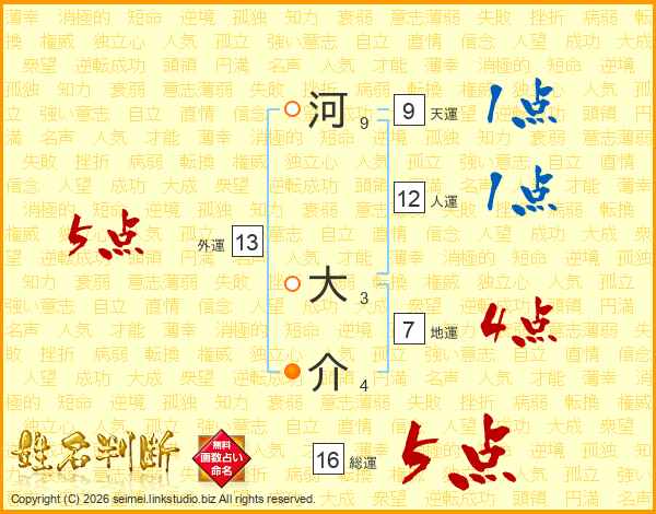 あなたの人生を表す1番重要な運勢です。生涯を通じて影響する総合運となり、主に50歳以降の晩年期に影響を及ぼします。苗字と名前の合計画数。