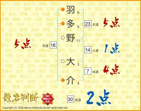 羽(6画)多(6画)野(11画) 大(3画)介(4画)