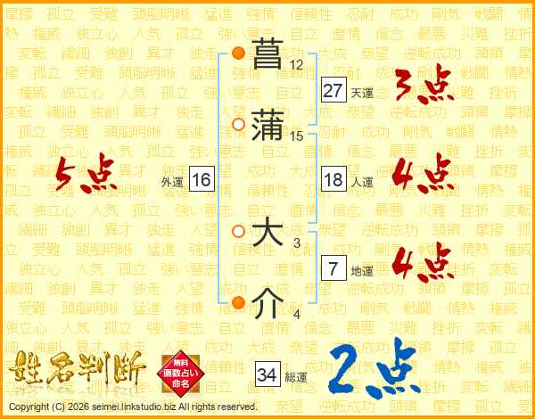 菖(12画)蒲(15画) 大(3画)介(4画)