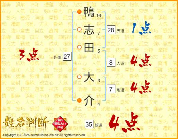 鴨(16画)志(7画)田(5画) 大(3画)介(4画)