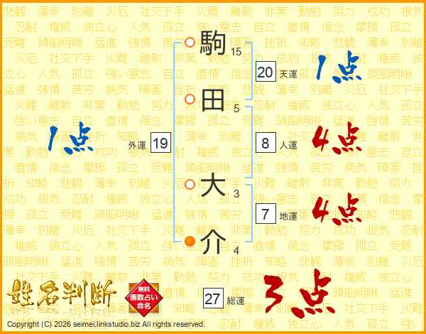生活面を象徴する運勢です。外部から受ける影響力を表し、結婚運、家庭運や職場、環境への順応性を表します。総運から人運を引いた画数。姓や名が1文字の場合を除く。