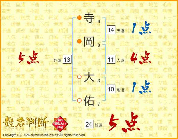 寺(6画)岡(8画) 大(3画)佑(7画)