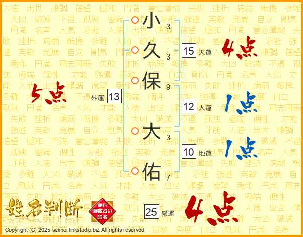 小(3画)久(3画)保(9画) 大(3画)佑(7画)