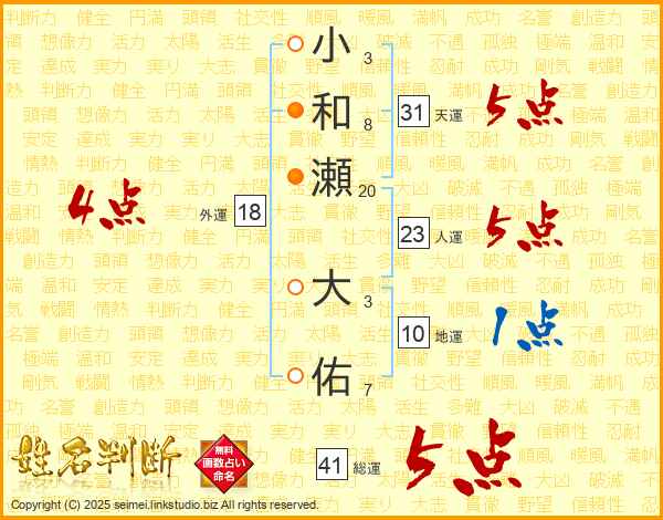 小(3画)和(8画)瀬(20画) 大(3画)佑(7画)
