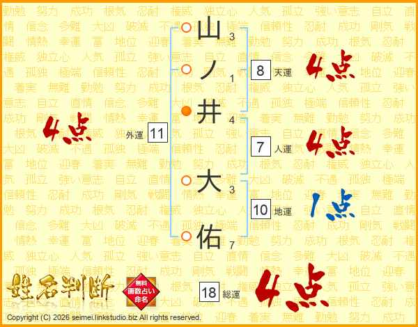 山(3画)ノ(1画)井(4画) 大(3画)佑(7画)