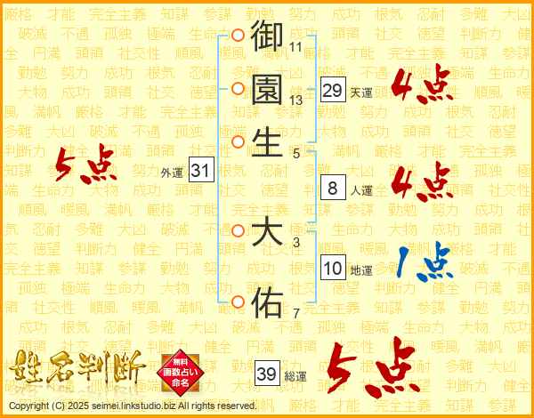 御(11画)園(13画)生(5画) 大(3画)佑(7画)