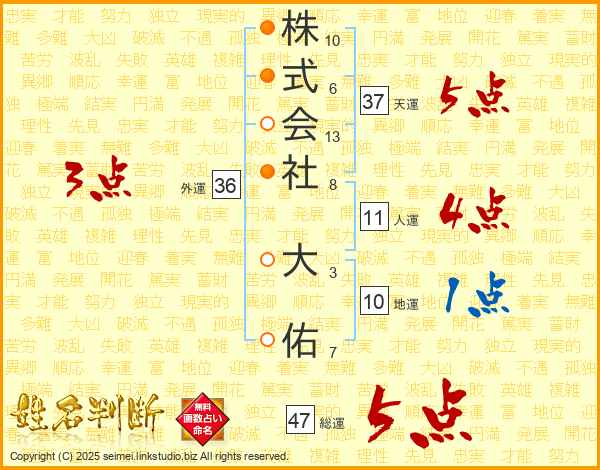 株(10画)式(6画)会(13画)社(8画) 大(3画)佑(7画)