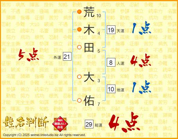 荒(10画)木(4画)田(5画) 大(3画)佑(7画)
