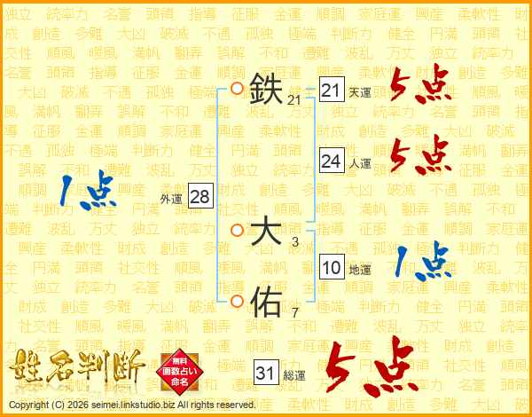 あなたの人生を表す1番重要な運勢です。生涯を通じて影響する総合運となり、主に50歳以降の晩年期に影響を及ぼします。苗字と名前の合計画数。