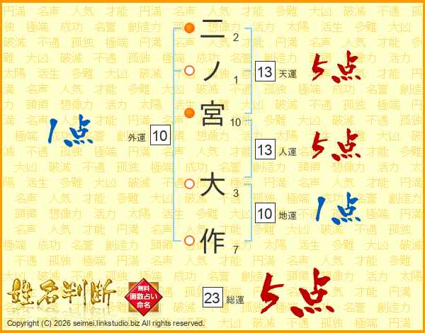 生活面を象徴する運勢です。外部から受ける影響力を表し、結婚運、家庭運や職場、環境への順応性を表します。総運から人運を引いた画数。姓や名が1文字の場合を除く。