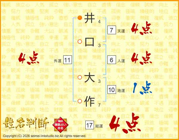 あなたの人生を表す1番重要な運勢です。生涯を通じて影響する総合運となり、主に50歳以降の晩年期に影響を及ぼします。苗字と名前の合計画数。