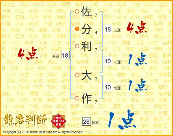佐(7画)分(4画)利(7画) 大(3画)作(7画)