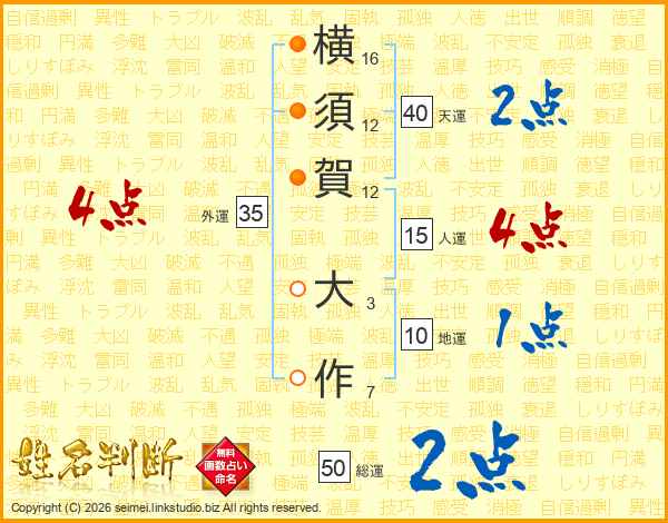 横(16画)須(12画)賀(12画) 大(3画)作(7画)