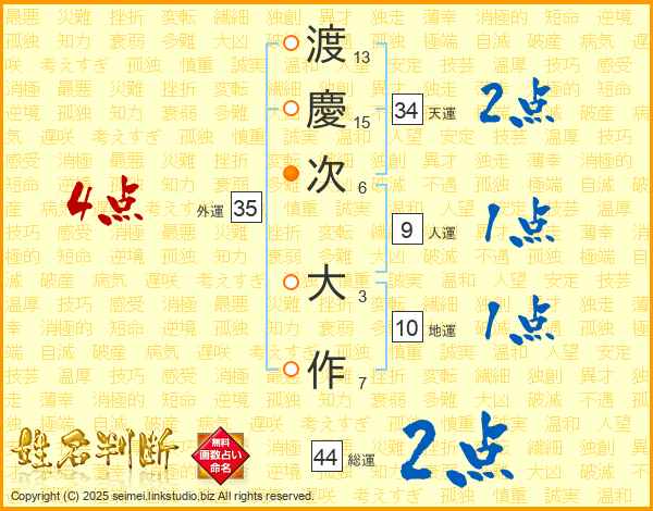 渡(13画)慶(15画)次(6画) 大(3画)作(7画)