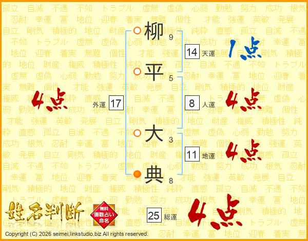 柳(9画)平(5画) 大(3画)典(8画)