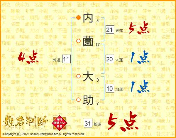 生活面を象徴する運勢です。外部から受ける影響力を表し、結婚運、家庭運や職場、環境への順応性を表します。総運から人運を引いた画数。姓や名が1文字の場合を除く。