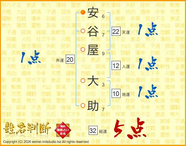 安(6画)谷(7画)屋(9画) 大(3画)助(7画)