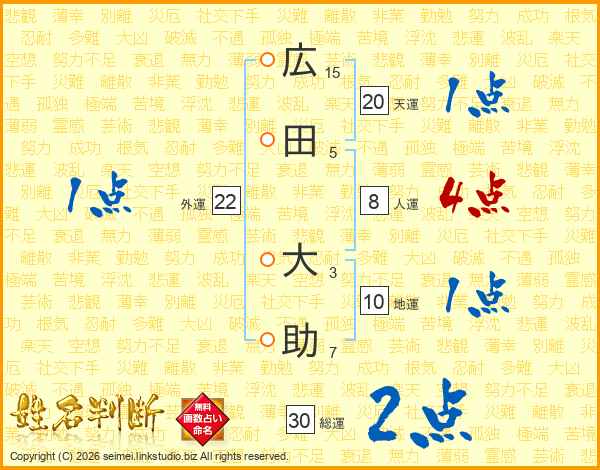 生活面を象徴する運勢です。外部から受ける影響力を表し、結婚運、家庭運や職場、環境への順応性を表します。総運から人運を引いた画数。姓や名が1文字の場合を除く。