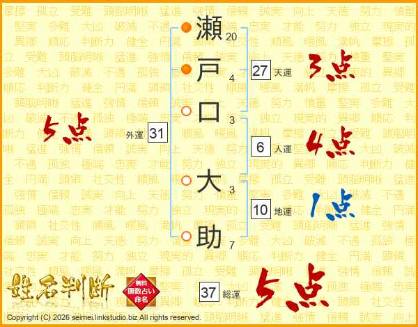 瀬(20画)戸(4画)口(3画) 大(3画)助(7画)