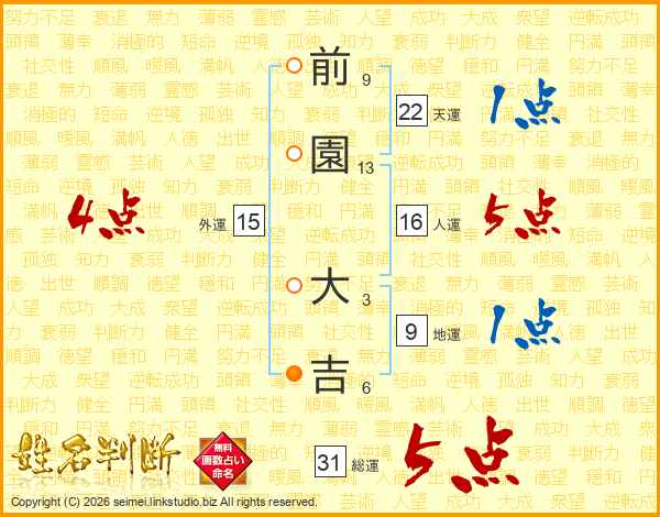 生活面を象徴する運勢です。外部から受ける影響力を表し、結婚運、家庭運や職場、環境への順応性を表します。総運から人運を引いた画数。姓や名が1文字の場合を除く。