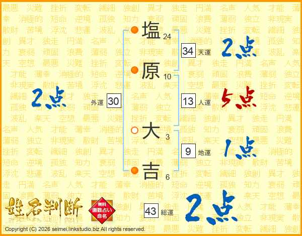 あなたの人生を表す1番重要な運勢です。生涯を通じて影響する総合運となり、主に50歳以降の晩年期に影響を及ぼします。苗字と名前の合計画数。