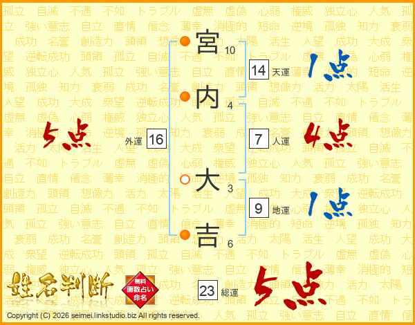 生活面を象徴する運勢です。外部から受ける影響力を表し、結婚運、家庭運や職場、環境への順応性を表します。総運から人運を引いた画数。姓や名が1文字の場合を除く。