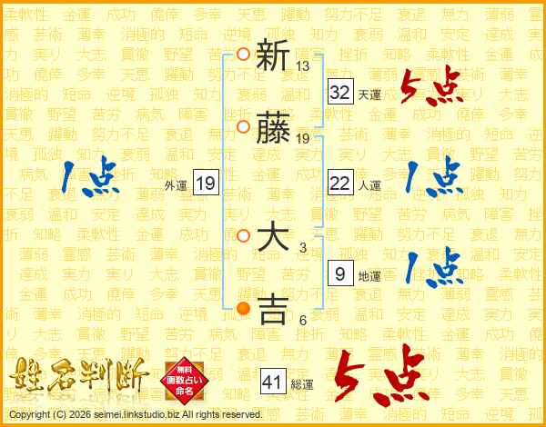 あなたの人生を表す1番重要な運勢です。生涯を通じて影響する総合運となり、主に50歳以降の晩年期に影響を及ぼします。苗字と名前の合計画数。