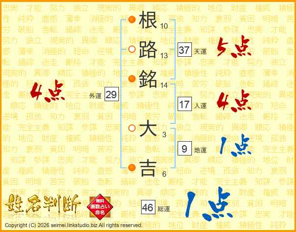 根(10画)路(13画)銘(14画) 大(3画)吉(6画)