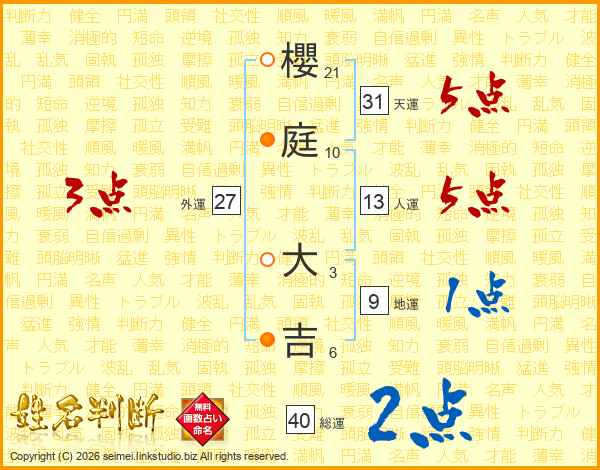 櫻(21画)庭(10画) 大(3画)吉(6画)