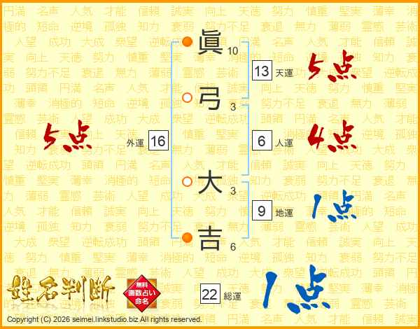 眞(10画)弓(3画) 大(3画)吉(6画)