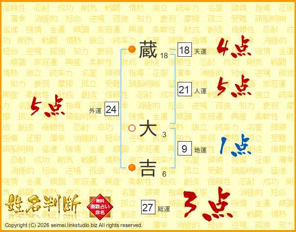 あなたの人生を表す1番重要な運勢です。生涯を通じて影響する総合運となり、主に50歳以降の晩年期に影響を及ぼします。苗字と名前の合計画数。