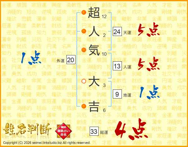 超(12画)人(2画)気(10画) 大(3画)吉(6画)
