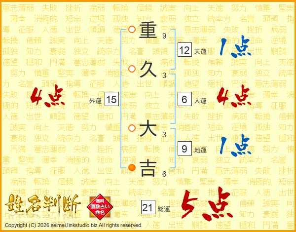 重(9画)久(3画) 大(3画)吉(6画)