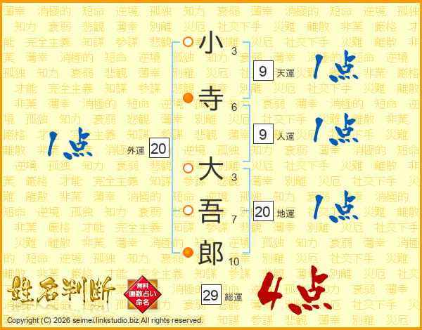 小(3画)寺(6画) 大(3画)吾(7画)郎(10画)