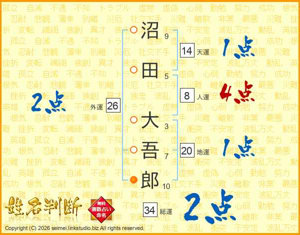 沼(9画)田(5画) 大(3画)吾(7画)郎(10画)