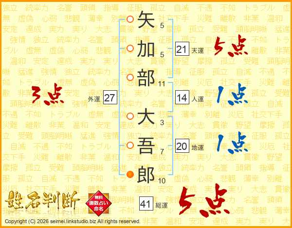 矢加部大吾郎さんの総運は41画の5点!