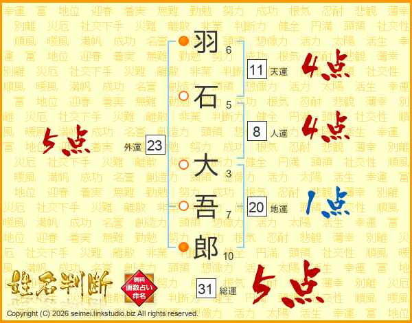 羽(6画)石(5画) 大(3画)吾(7画)郎(10画)