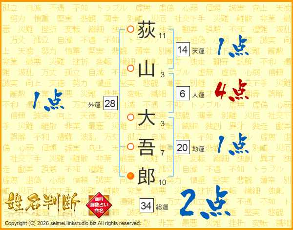荻(11画)山(3画) 大(3画)吾(7画)郎(10画)