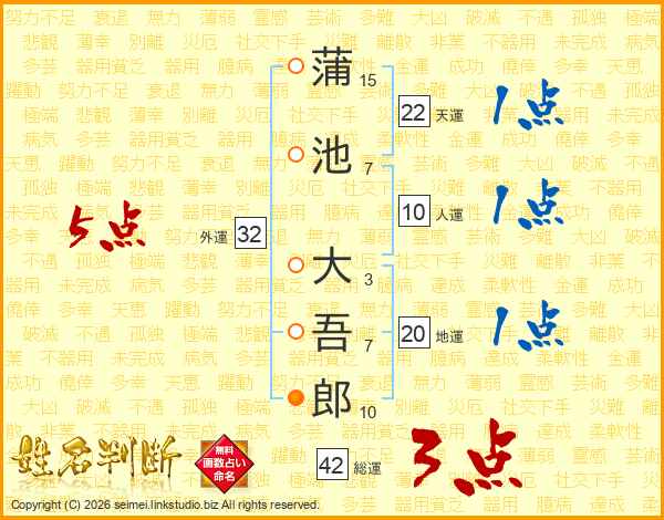 蒲(15画)池(7画) 大(3画)吾(7画)郎(10画)