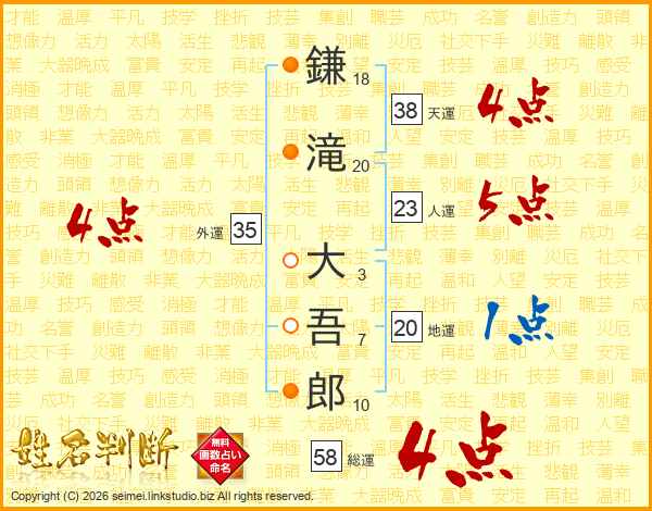 鎌(18画)滝(20画) 大(3画)吾(7画)郎(10画)