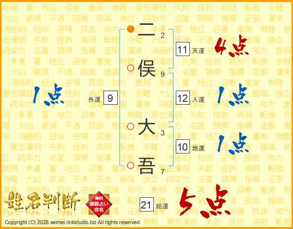 生活面を象徴する運勢です。外部から受ける影響力を表し、結婚運、家庭運や職場、環境への順応性を表します。総運から人運を引いた画数。姓や名が1文字の場合を除く。