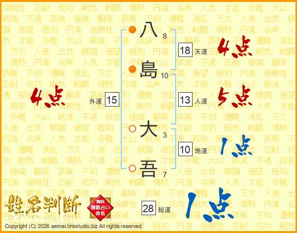 家系が持つ宿命的な運勢を表します。祖先から受け継いだ苗字ですので自分の力が及びません。家柄を象徴します。苗字の合計画数。